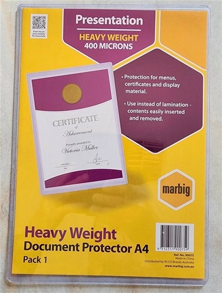 Marbig document protectors is made from crystal clear, rigid high quality PVC | Can be used as an alternative to lamination, with the added benefit of being able to easily remove the contents and replace them | Excellent protection for certificates, menus and display material | Sealed on 3 sides contents are easily inserted or removed and can be wiped clean | Durable and easy to clean