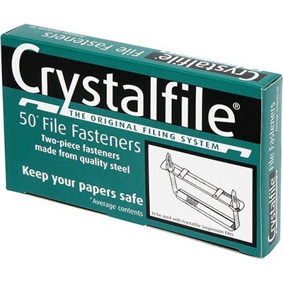 Crystalfile two piece file fasteners made from quality steel to keep all your documents safe | With a locking mechanism to keep your documents more secure, just slip your punched documents onto the prongs, pop compressor bar over the top and fold | Simply add your documents then lock down the fastener | Made from quality steel | Ideal for use with crystalfile suspension files | Keep your documents secure | Box of 50