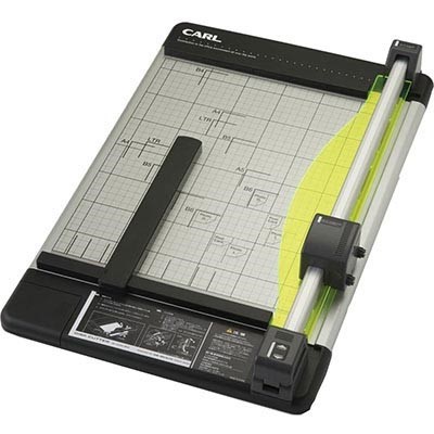 Carl trimmer features standard size paper markings to enable easy use, ergonomic design with magnetic paper size guide, rail mechanism to hold paper firmly in place and extra large cutting capacity | Fluorescent and luminous ABS cutting guide for increased accuracy | Adjustable magnetic paper gauge holds paper on calibrated metal base | Sturdy black/silver metal base manufactured with high quality Japanese steel | Designed for specialist or frequent commercial use on a variety of papers