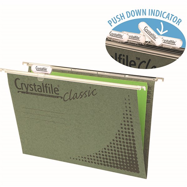 Crystalfile suspension files are the perfect way to store all your important files | Made from manilla board and smooth nylon runners, they are the ideal choice for your suspension filing needs | Made from quality manilla board | Made from 100% recycled board and is 100% recyclable | Nylon runners ensure smooth, quiet gliding of suspension files | Pre-Punched and ready to use with Crystalfile file fasteners | Suitable for filing cabinets, desk drawer chassis and desk top organisers | Ideal for long term use | Includes tabs and inserts
