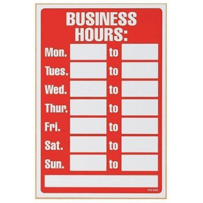 The Business Hours Sign is an effective and convenient way of displaying your opening hours | The sign is made from durable styrene plastic and is suitable for both indoor and outdoor use | Perfect for use by retail stores, restaurants, cafes, salons and other businesses to clearly display opening hours to customers | Choose from the extensive range of signs