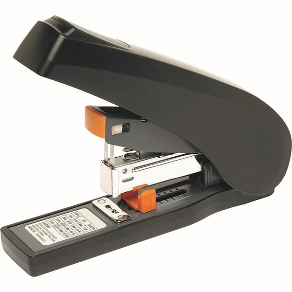 Low force technology at an economical price- Utilising a patented mechanism designed to decrease the force needed, for effortless stapling | Staples up to 100 sheets of paper (80gsm) | Heavy duty plastic stapler with inner metal support | Requires 60% less force than conventional staplers | Low staple indicator | Convenient, top loading refill mechanism | For 24/6, 23/10-13, 23/13 Marbig staples