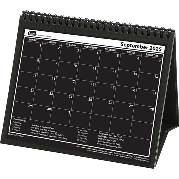 Two options available- black viewing pages or white (on reverse side) | One month per page format | National public holidays (Australia and NZ) included | Folds open to stand by itself on desktop
