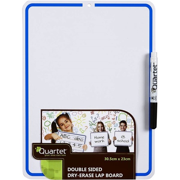 Quartet non-magnetic lap boards are the perfect tool for children to use in the classroom or at home | The convenient size boards can easily be transported | Ideal for children learning to draw or practicing writing | Blue border adds a pop of colour to boards | Perfect for classroom or home use | Boards are light and easy to carry with you | Plastic frame, tin dry erase surface is easy to write on | Corners are rounded for extra safety | Perfect for writing messages, reminders and to-do lists | Built in peg hole allows board to be hung on a wall for easy storage | One side blank for drawing | The other side lined to assist with writing letters or sentences straight | Includes marker