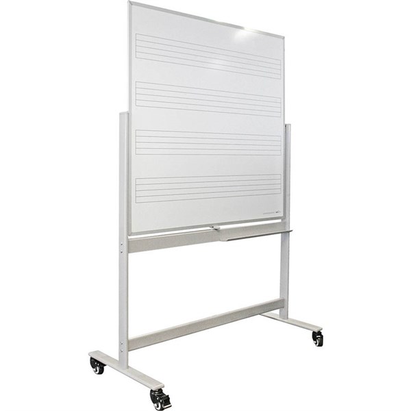 Permanently ruled with 4 music staves | Magnetic surface featuring pivoting double sided board with lines one side and plain whiteboard the other side | Dry wipe surface | Board pivots 360 degrees | Steel stand with heavy duty castors (2 locking) | Pen tray included | Supplied with red, blue and black whiteboard markers