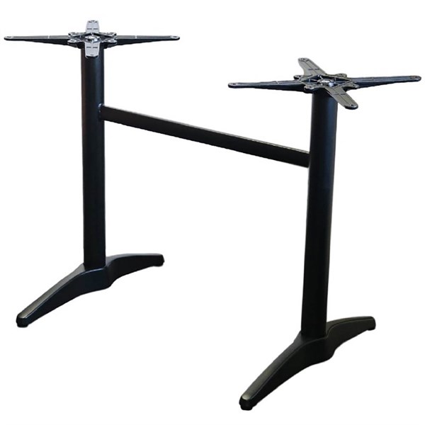 Quality black powdercoated aluminium twin table base suitable for indoor and outdoor use in all commercial applications | Top Plates: Cast aluminium top plates with 8 fastening points | Recommended table top max weight and size: 1400 x 800mm, 21kg | Will suit rectangle Duratop | 4 adjustable levelling feet