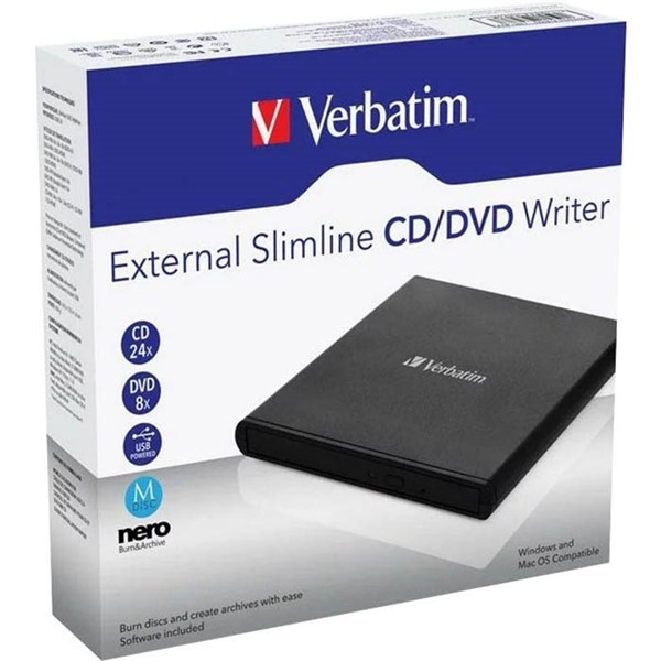 - The Verbatim Slimline CD/DVD Writer features Nero Burn & Archive software for seamless archiving, and reliable secure disc burns | Read and write CD's and DVD's any time, any place - ideal notebook/ultrabook accessoryrn8X DVD Write Speed, 24X CD Write Speed | Compact and lightweight - easily fits into laptop bag or backpack \ USB powered - no need to carry additional AC adapter | Compatible with all common CD and DVD formats | M-Disc Ready - perfect archival solution with industry-leading disc lifetime expectancies | Features Nero Burn & Archive software 2-Year Limited Warranty | Software compatible with Windows operating systems only | This product requires a 3rd party application to playback video and audio files through all operating systems