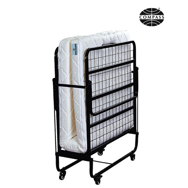 Sturdy black powder coated metal frame | Mattress holder bars at head and base of the bed | Lightweight for easy maneuverability | Side lock hinges | Two wheel locks | Removable zip on washable quilted cover | 10 cm foam mattress included