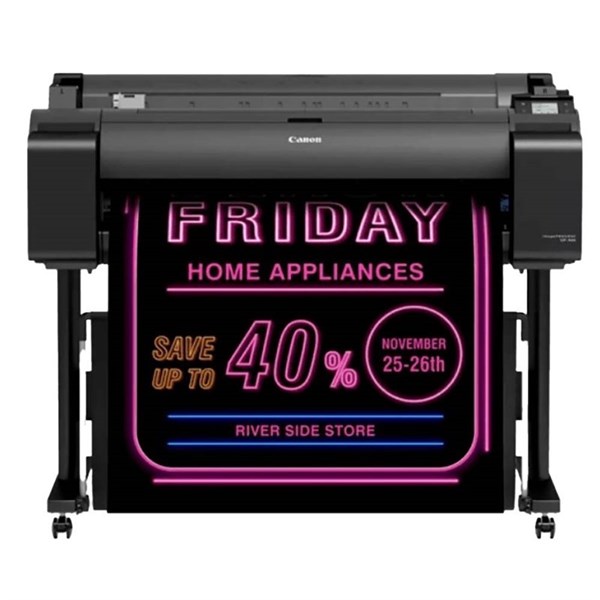 The 36" GP-300 is a 5-color (MBK, BK, C, M, Y) plus Fluorescent Pink Ink large format printer | Equipped with Canon's unique Radiant Infusion which layers the newly developed Fluorescent Pink Ink with other inks on the paper surface during printing creating bright and soft color reproduction | This model is ideal for supporting in-house production of large format prints with increased appeal and visibility in various industries such as retail stores, restaurants, government offices, schools and general companies